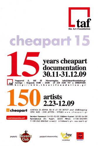 – Δευτερα 30 Νοεμ. 20:00.. PARTY και εκθεση 15 χρονια Cheapart @ Taf (Νορμανου 5 Μοναστηρακι – Καθετος Πεζοδρομος στην Ερμου)