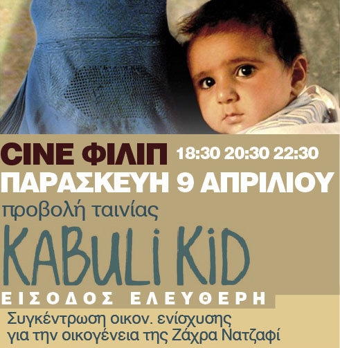 ΠΡΟΒΟΛΗ ΤΑΙΝΙΑΣ “KABULI KID” ΣΤΟΝ ΚΙΝΗΜΑΤΟΓΡΑΦΟ ΦΙΛΙΠ ΤΗΝ ΠΑΡΑΣΚΕΥΗ 9 ΑΠΡΙΛΙΟΥ 2010, ΩΡΕΣ: 18:30, 20:30, 22:30, (οδός Θάσου 11 , τηλ: 210-8612476 περιοχή Πλατεία Αμερικής)